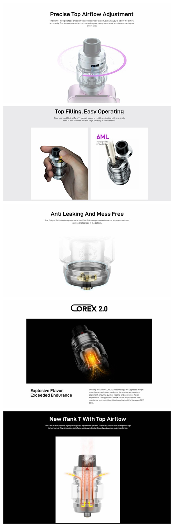 O iTank T apresenta o tão aguardado sistema de fluxo de ar superior. O fluxo de ar superior direto junto com o fluxo de ar de cima para baixo garante uma vaporização satisfatória, ao mesmo tempo em que melhora significativamente a resistência a vazamentos.